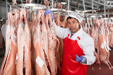 Male slaughterhouse worker showing mutton carcass in meat storage