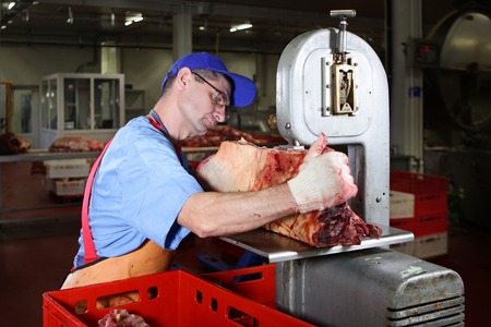 butcher in meat industry interior, factory for production of sausages and other meat products