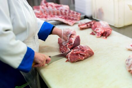 A slaughterhouse worker cuts chunks of meat into portions. A concept of sausage and delicatessen production. Macro photo of a raw piece of meat. Hands out of focus. Professional equipment for cutting meat.