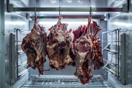 Fresh cuts of meat hanging from hooks in a refrigerator, ready to be used as ingredients in various dishes. An essential part of any cuisine and cooking service