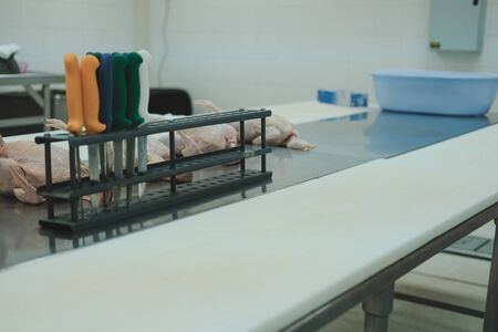 Meat processing plant.People working at a chicken factory - stock photo.Automated production line in modern food factory.