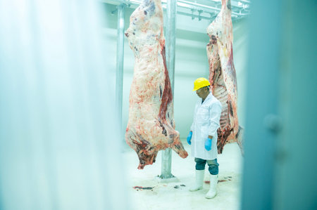 Fresh beef cuts hang in an industrial meat processing facility, showcasing the quality and preparation of meat for culinary uses, emphasizing hygiene and freshness.