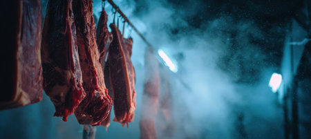 Detailed close-up of red meat sections hanging on hooks, showcasing sharp textures and cold tones in a chilled, cinematic setting. The image captures the realism of a meat storage environment.