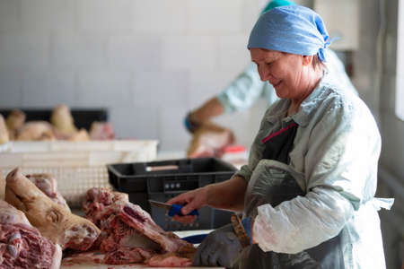 Bilarus, the city of Gomil, April 26, 2019. The meat factory. Slaughterhouse. Workers in the meat shop at work. Woman butcher cuts pork carcasses with a knife