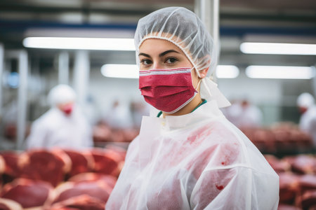 A woman wearing protective face mask and gloves cutting meat with a knife, Woman working in a butchery, wearing protective clothes and gloves, AI Generated
