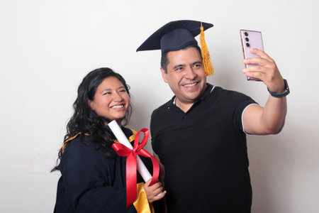 Proud and satisfied single dad with his brunette Latina daughter, a graduate dressed in a cap and gown, celebrates the end of the school