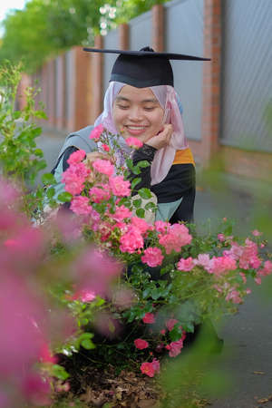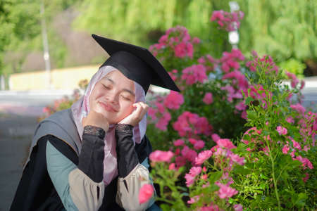 Beautiful female Muslim wearing a convocation robe and posed in happiness style after graduation ceremony.