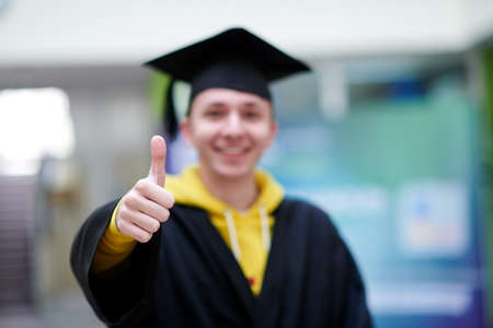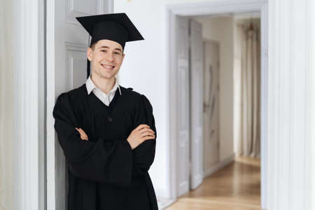 Education, graduation and people concept - happy male student at home showing his emotions