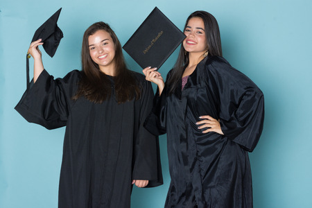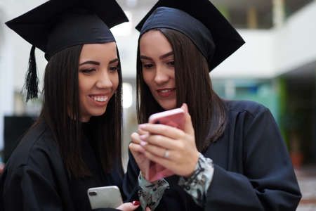 During the presentation of graduation diplomas at the university, two beautiful girls in academic gowns and caps take selfies and smile