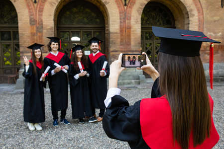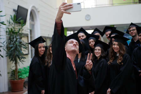 Young graduation students take photo on the phone at campus after ceremony