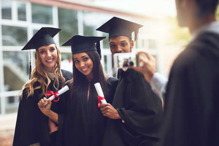 Well look back proudly at this moment. a group of students taking photos on graduation day.