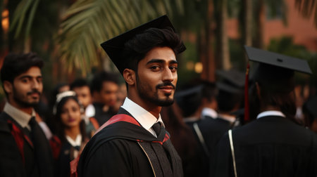 Happy indian male graduate against the background of university graduates. Generative Ai