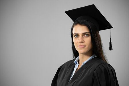 Portrait of a happy Caucasian female student wearing a gown and a hat graduating from high school college looking at camera on grey