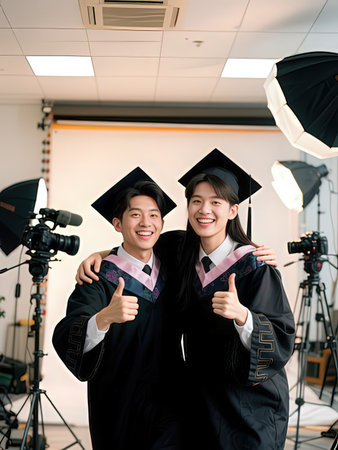 Happy asian university students with graduation cap and gown showing thumbs up