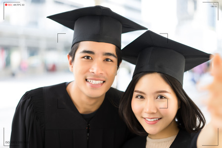 Portrait of two happy graduating students make selfie recording video vlog from hands with mirrorless camera. Camera screen of Asian graduating couple volgging talking on live stream at the city, having fun outdoors. Camera for photographer or Video and Live Streaming concept.