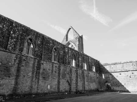 TINTERN, UK - CIRCA SEPTEMBER 2019: Tintern Abbey (Abaty Tyndyrn in Welsh) ruins in black and white