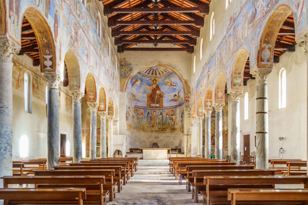 Capua, Campania, Italy, February 2021: Inside of Benedictine Abbey of Sant Angelo in Formis, the walls are covered with frescoes from the second half of the 11th century. Capua, Campania, Italy.