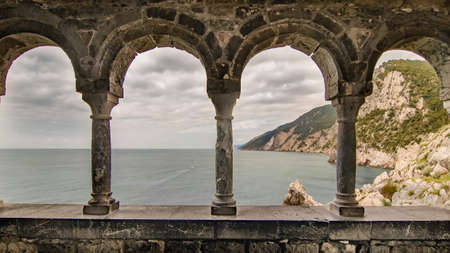 The gothic black and white stone interior of the 12th century San Pietro church in the town of Porto Venere or Portovenere in the La Spezia province of the Liguria region in northern Italy