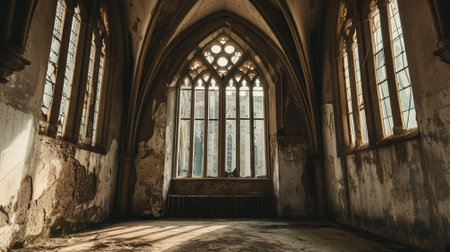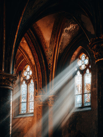 Sunlight filters through gothic windows in a historical interior, illuminating the architectural details and casting light beams.