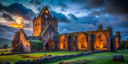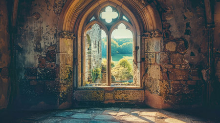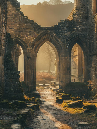 Ruins of an ancient abbey at dawn, atmospheric light enhancing the historic details, tranquil and peaceful atmosphere