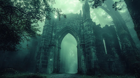 An eerie image of an ancient archway engulfed in mist within a dense, shadowy forest, evoking a sense of mystery and foreboding.