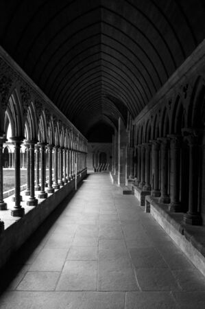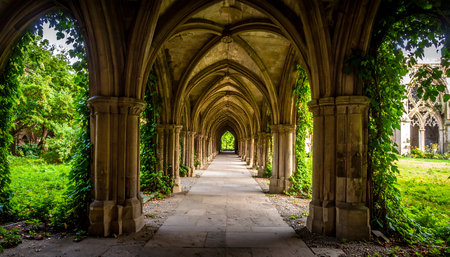 Ancient Gothic Cloister Walkway with Arched Stone Vaulting and Ivy Covered Columns