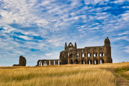 Ruins of an abbey stand on a grassy hill under a bright blue sky with white, scattered clouds. Golden grass surrounds the stone structures in Whitby, UK.