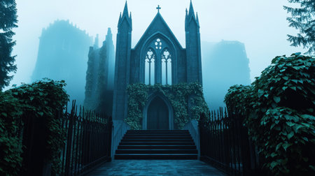 Explore a haunting gothic church engulfed in thick fog and surrounded by emerald ivy, creating an eerie atmosphere ideal for mysterious and supernatural themes.