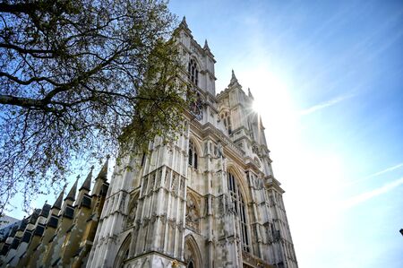 Classic Gothic architecture with pointed arches and sculpted details, blank space in background