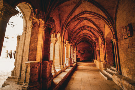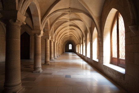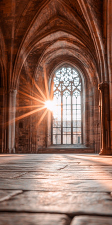 Golden sunlight streams through arched windows, illuminating the stone floor of a magnificent gothic cloister. The empty hall, rich with history and academic tradition, evokes a sense of peace, contemplation, and the timeless pursuit of knowledge.