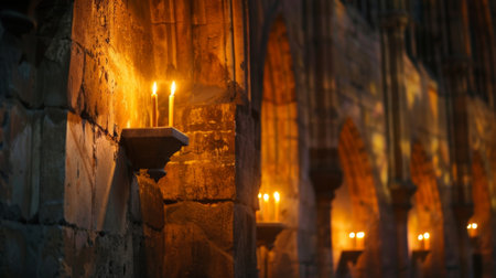 The entrance of a Gothicstyle cathedral is illuminated by alcoves in the stone walls each holding a flickering candle to guide worshippers into the depths of the church. 2d flat cartoon