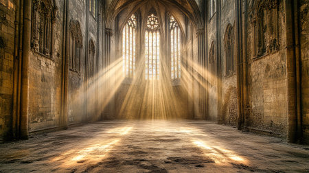Sunlight streams through tall stained glass windows, casting golden rays across the dusty floor of a gothic cathedral. The atmosphere is serene, inviting reflection and contemplation.