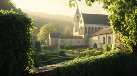 A serene monastery stands amidst vibrant gardens, bathed in soft morning light. The lush surroundings and rolling hills create a peaceful atmosphere, inviting reflection.
