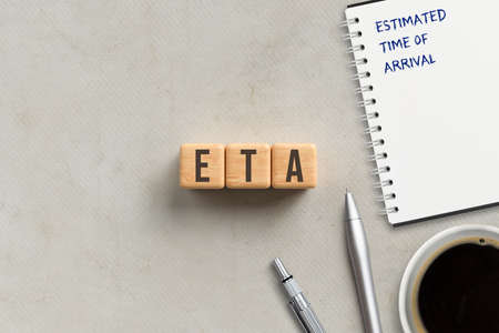 cubes with acronym ETA and notepad with explanation ESTIMATED TIME OF ARRIVAL on paper background