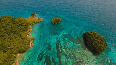 Islands are surrounded by an atoll and a coral reef with blue water top view. Bucas grande, Philippines. Summer and travel vacation concept.