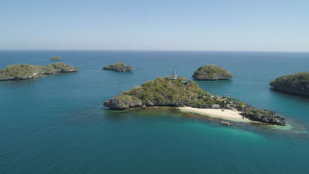 Small islands in Hundred Islands National Park with statue of Jesus Christ, Pangasinan, Philippines. Aerial view of group of small islands with beaches and lagoons, famous tourist attraction, Alaminos.
