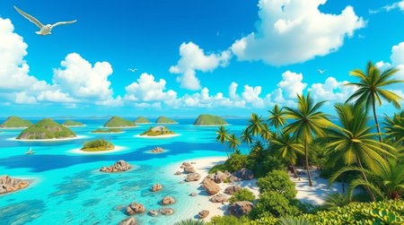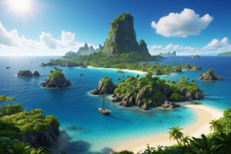 tropical island with palm trees and blue sky. 3d render