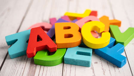 Alphabet abc on blue wooden table background. Copy space. ABC education concept. Selective focus