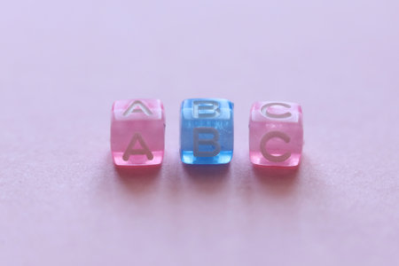 ABC is alphabetical characters on a pink background. Wooden alphabetical blocks, isolated against a pink background. English alphabet. View from above. Words. English language. Grammar