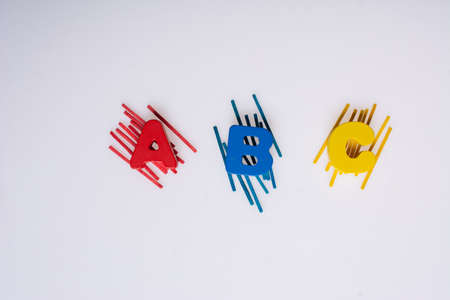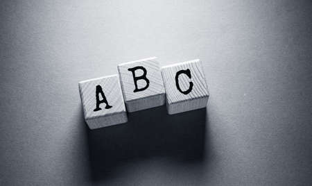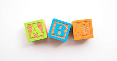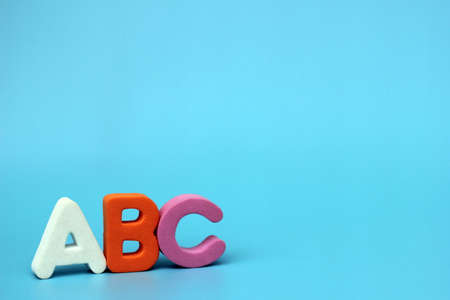 Wooden letters ABC on blue and yellow background. The concept of the importance of education. Background with diagonal shadows.