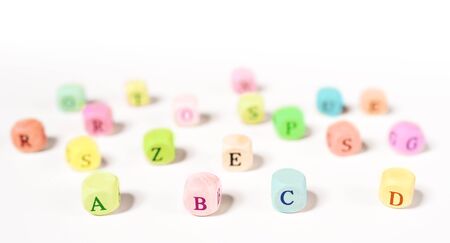 Text dice cube concept / Letter dices alphabet on wooden background. Block of alphabet studded on the floor.