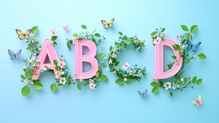 Colorful letters A, B, C, and D are surrounded by delicate flowers and butterflies against a bright blue background, creating a cheerful spring ambiance perfect for early learners and decorations.