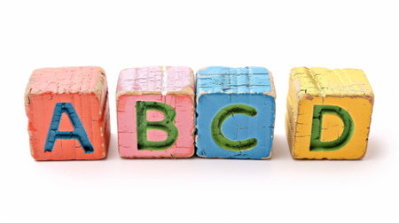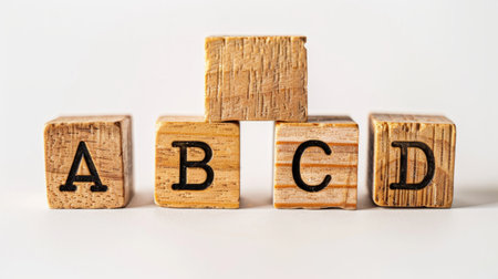 top view perspective closeup of A B C and D letters of the alphabet cut in wood on colored paper background