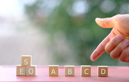Concept of SEO optimization. Wooden cubes with letters on a table.