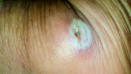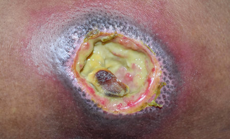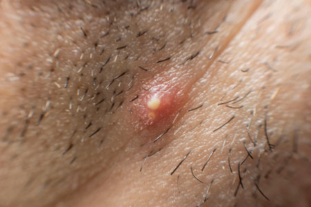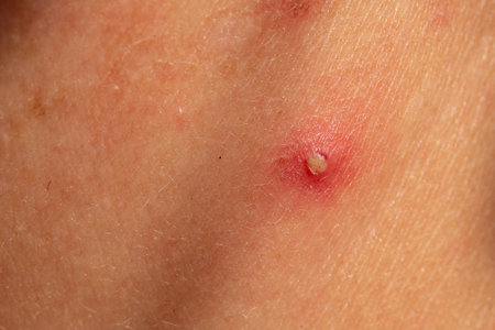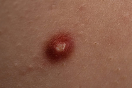 Detailed close-up image showing an infected skin lesion, highlighting redness, inflammation, and presence of pus.