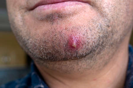 Bacterial skin infection. Big Acne Cyst Abscess or Ulcer Swollen area within face skin tissue. Containing accumulation of pus and blood. Macro shot of Acne or Dermatitis near mouth on face. Skincare.