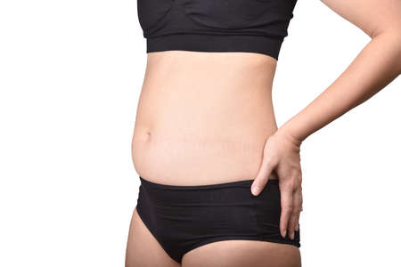 Skinny fat figured unrecognizable woman with belly fat. Woman`s hips closeup raw studio shot in grey background. Dieting and fat loss concept.