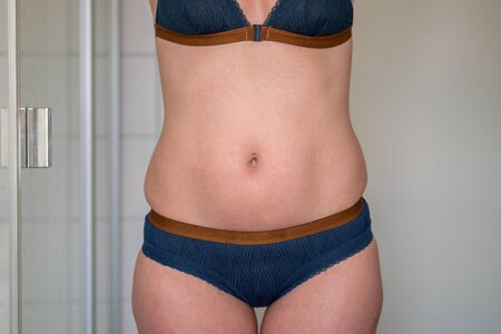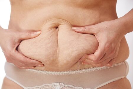female belly after childbirth, excess fat and stretched skin