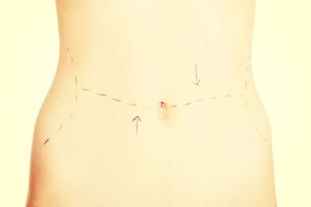 Woman belly marked out for cosmetic surgery. Isolated on white.