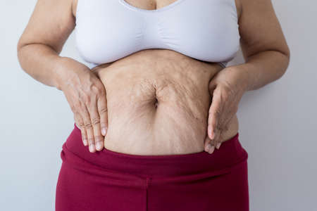 Overweight senior woman pinching her fat body,Cellulite,squeezing her belly fat around her belly button,Healthy lifestyle concept